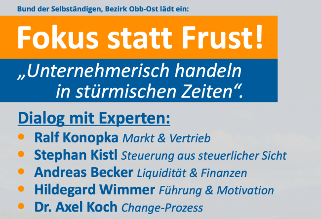 „Fokus statt Frust – unternehmerisch handeln in stürmischen Zeiten“ Mit hochaktuellen Themen, inspirierenden Referenten und praxisnahen Lösungen wollen wir gezielt Impulse setzen, die Ihnen helfen, auch in herausfordernden Zeiten sicher zu navigieren und Chancen aktiv zu nutzen. Im Fokus stehen zentrale Erfolgsfaktoren für Ihr Unternehmen, präsentiert von Experten aus dem BDS-Bayern: Liquidität & Finanzen steuerliche…