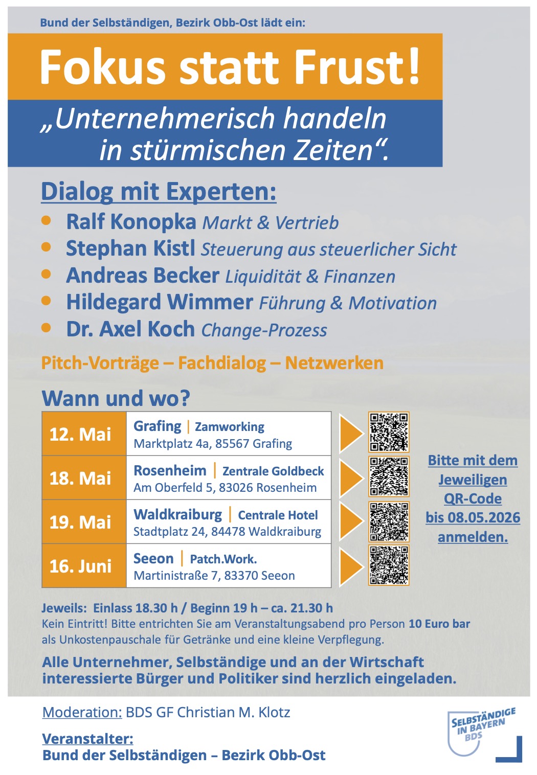 Im Bezirk Obb-Ost stehen Ihnen vier Termine zur Auswahl – wählen Sie den für Sie passenden aus. Alle Details zur Veranstaltungsreihe finden Sie in der anhängenden Einladung samt QR-Code für Ihre verbindliche Anmeldung.
